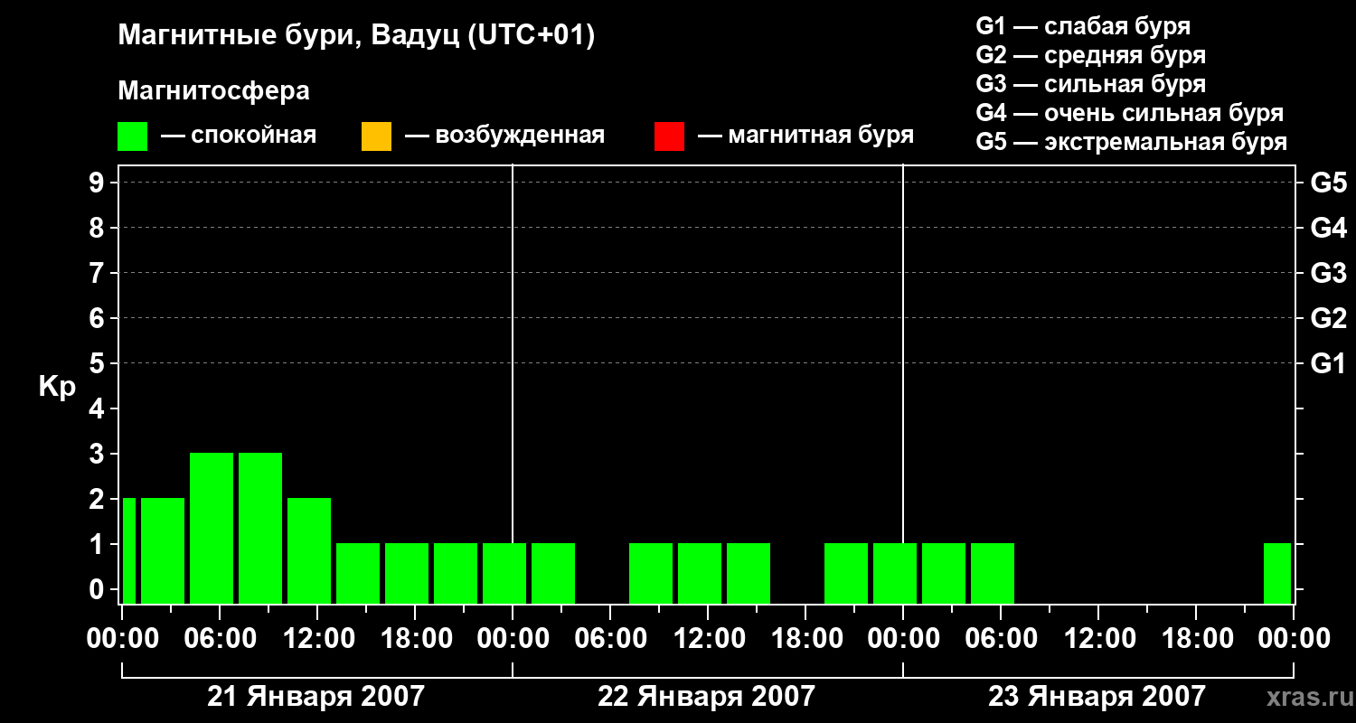 Изменения геомагнитного индекса Kp с 21 по 23 января 2007 года для средних широт
