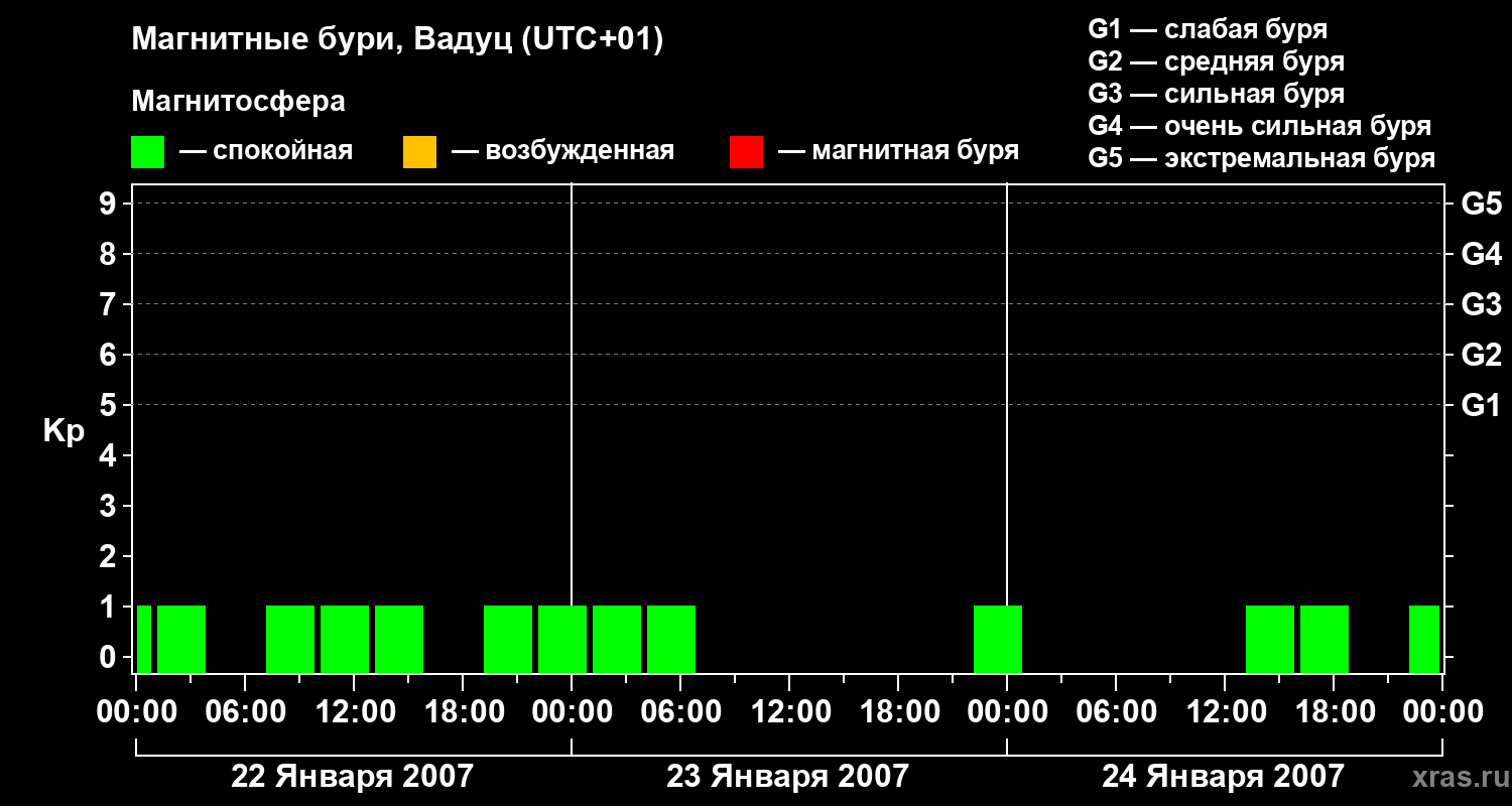 Изменения геомагнитного индекса Kp с 22 по 24 января 2007 года для средних широт
