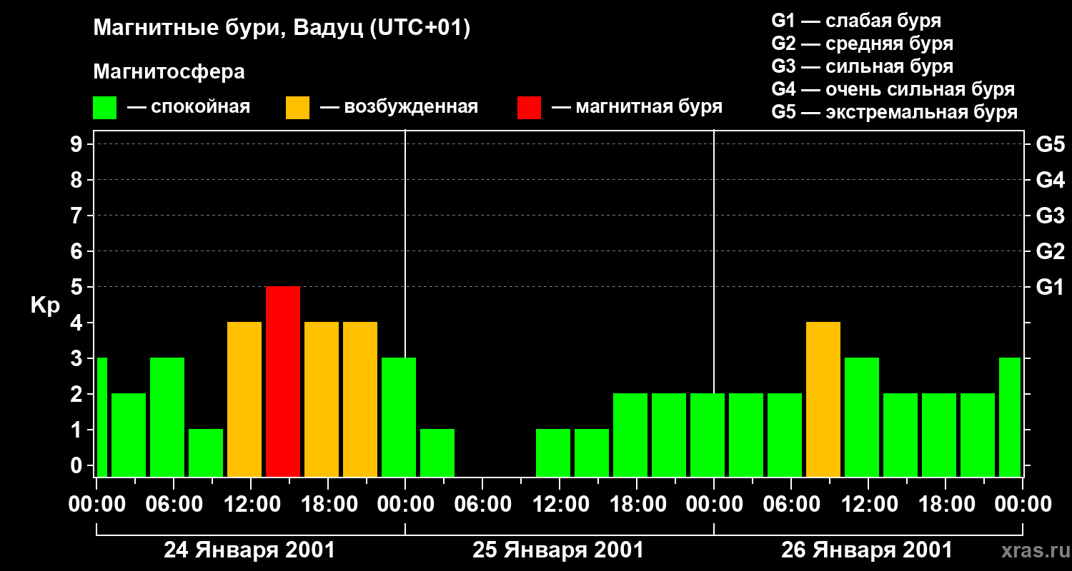 Изменения геомагнитного индекса Kp с 24 по 26 января 2001 года для средних широт