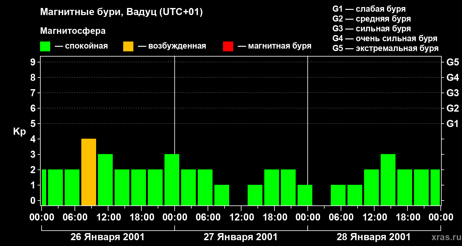 Изменения геомагнитного индекса Kp с 26 по 28 января 2001 года для средних широт