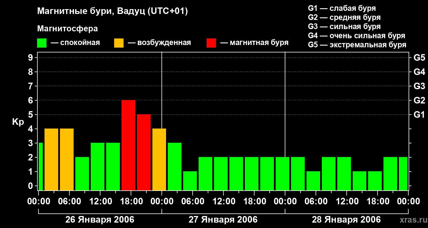 Изменения геомагнитного индекса Kp с 26 по 28 января 2006 года для средних широт