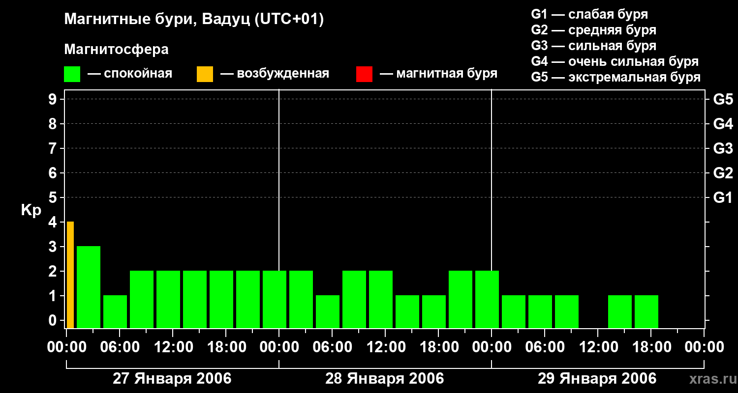 Изменения геомагнитного индекса Kp с 27 по 29 января 2006 года для средних широт