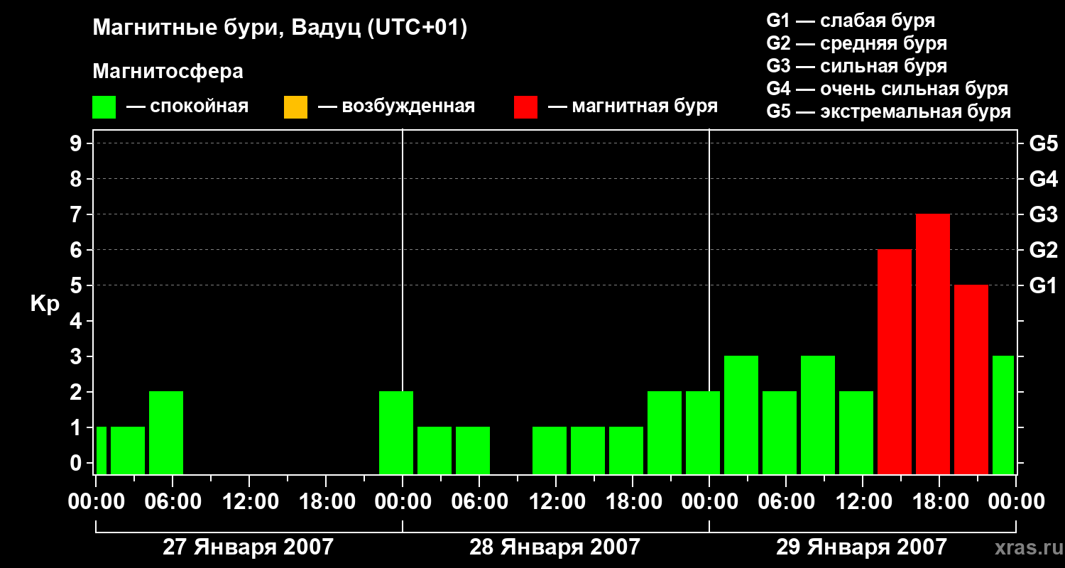 Изменения геомагнитного индекса Kp с 27 по 29 января 2007 года для средних широт