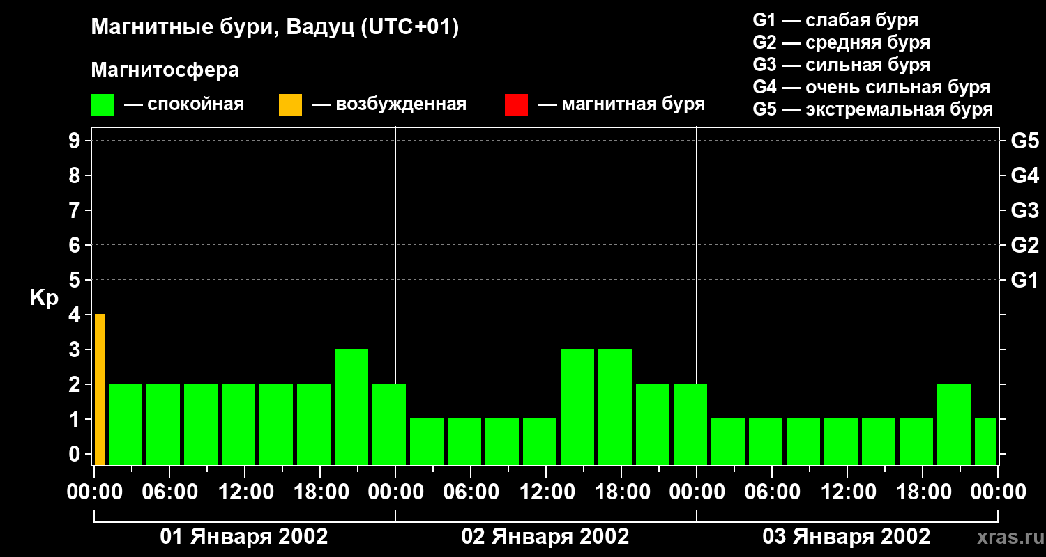 Изменения геомагнитного индекса Kp с 1 по 3 января 2002 года для средних широт