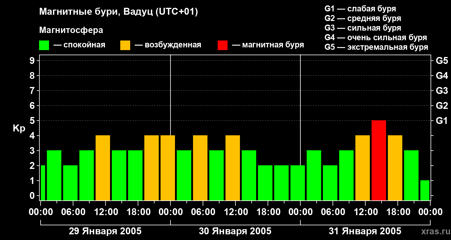 Изменения геомагнитного индекса Kp с 29 по 31 января 2005 года для средних широт