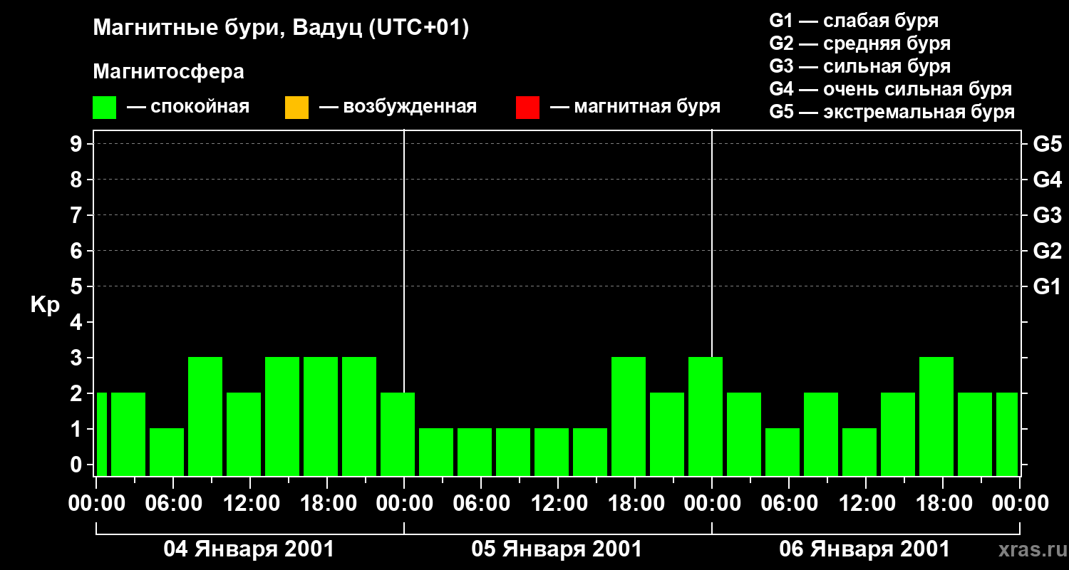 Изменения геомагнитного индекса Kp с 4 по 6 января 2001 года для средних широт
