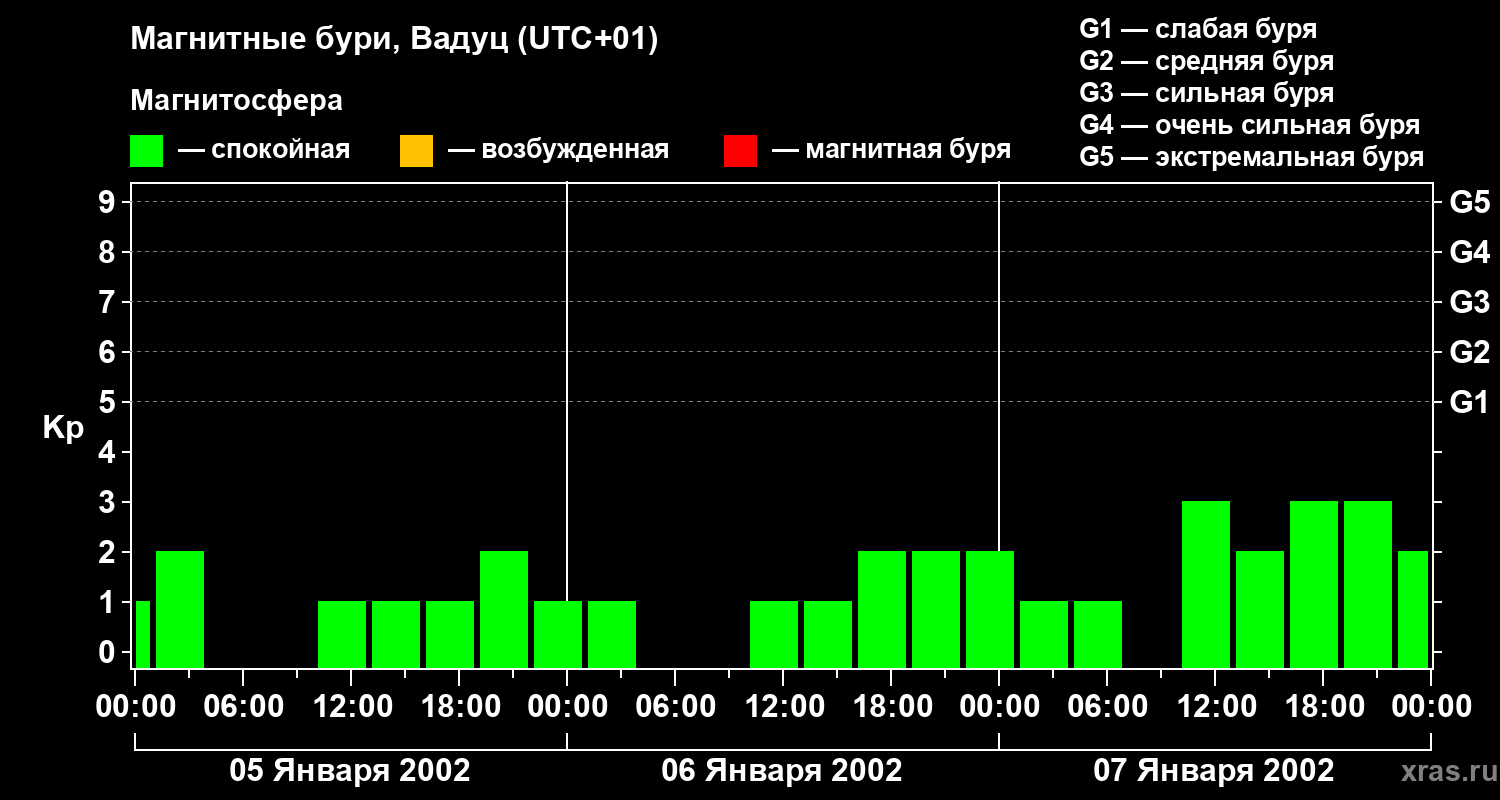 Изменения геомагнитного индекса Kp с 5 по 7 января 2002 года для средних широт