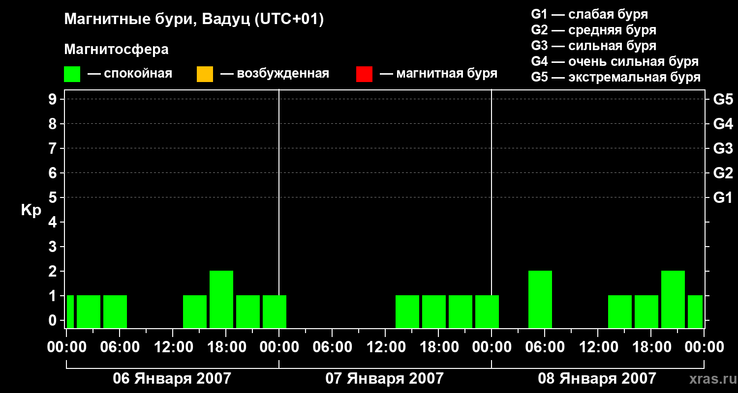 Изменения геомагнитного индекса Kp с 6 по 8 января 2007 года для средних широт