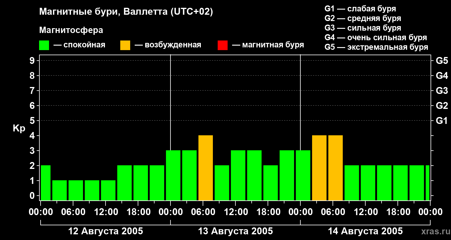 Изменения геомагнитного индекса Kp с 12 по 14 августа 2005 года для средних широт