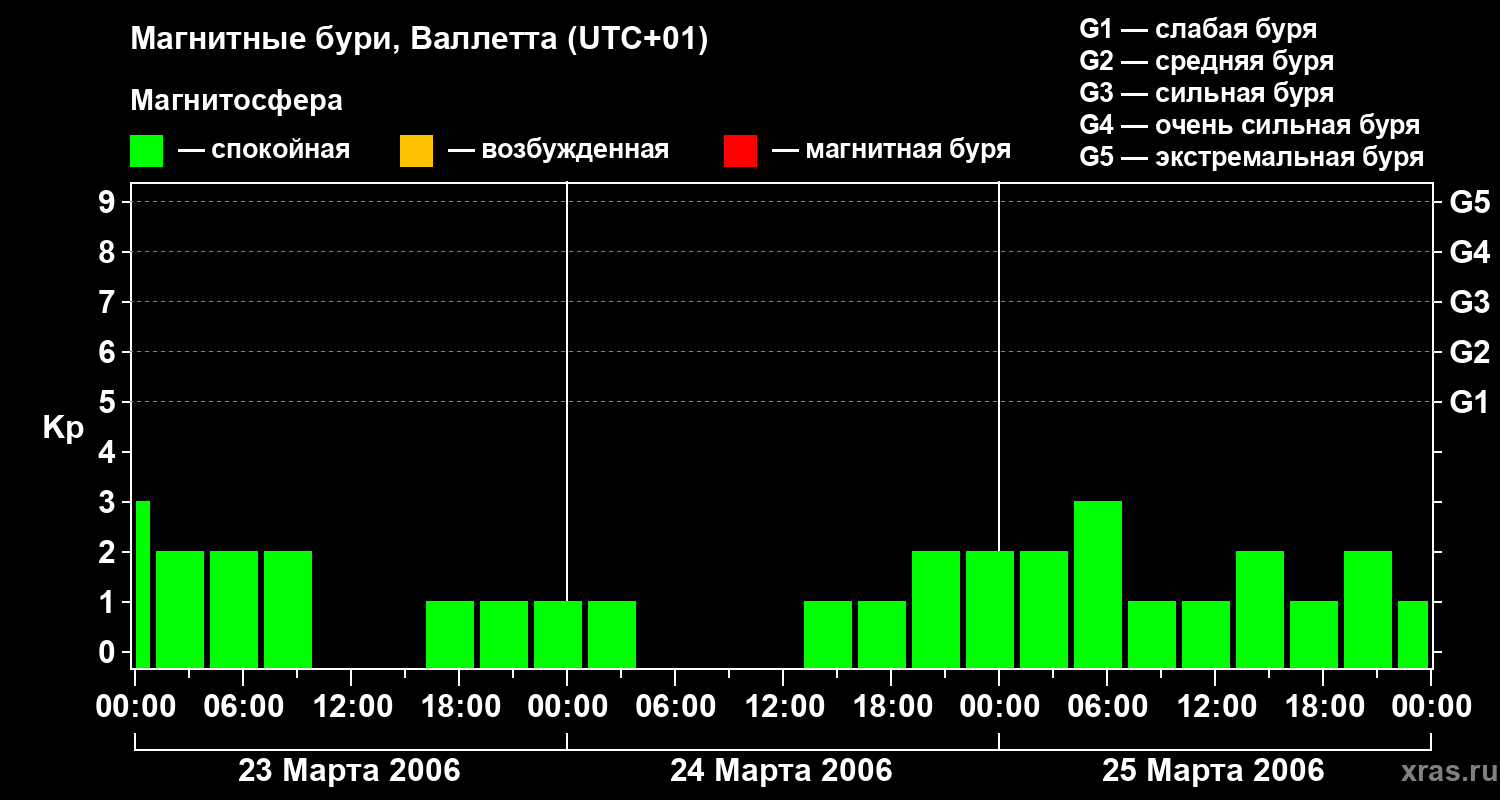 Изменения геомагнитного индекса Kp с 23 по 25 марта 2006 года для средних широт