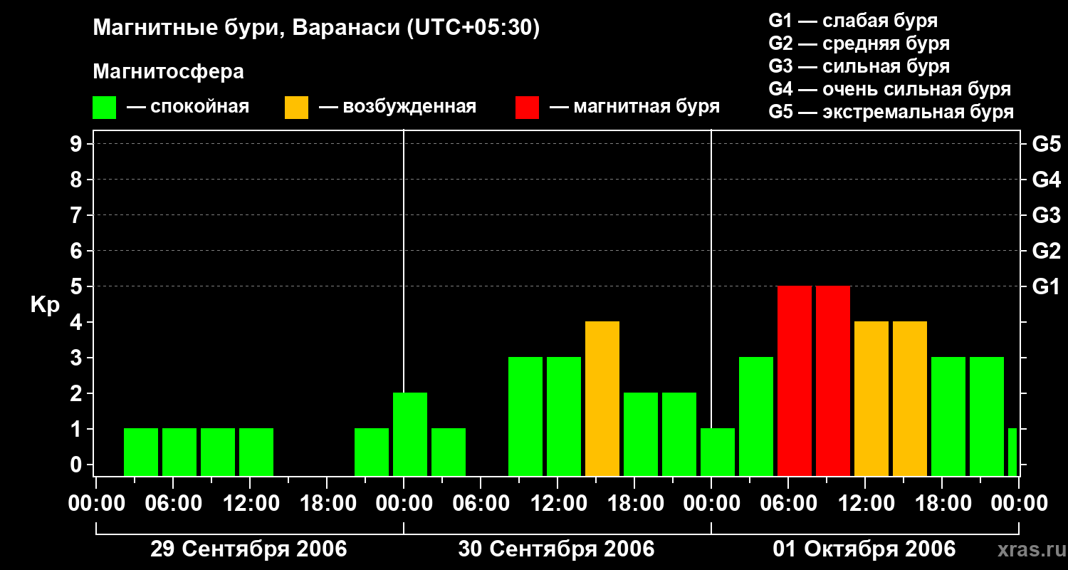 Изменения геомагнитного индекса Kp с 29 сентября по 1 октября 2006 года для средних широт