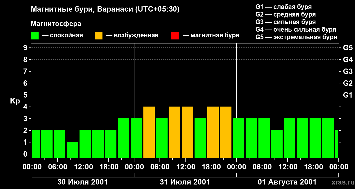Изменения геомагнитного индекса Kp с 30 июля по 1 августа 2001 года для средних широт