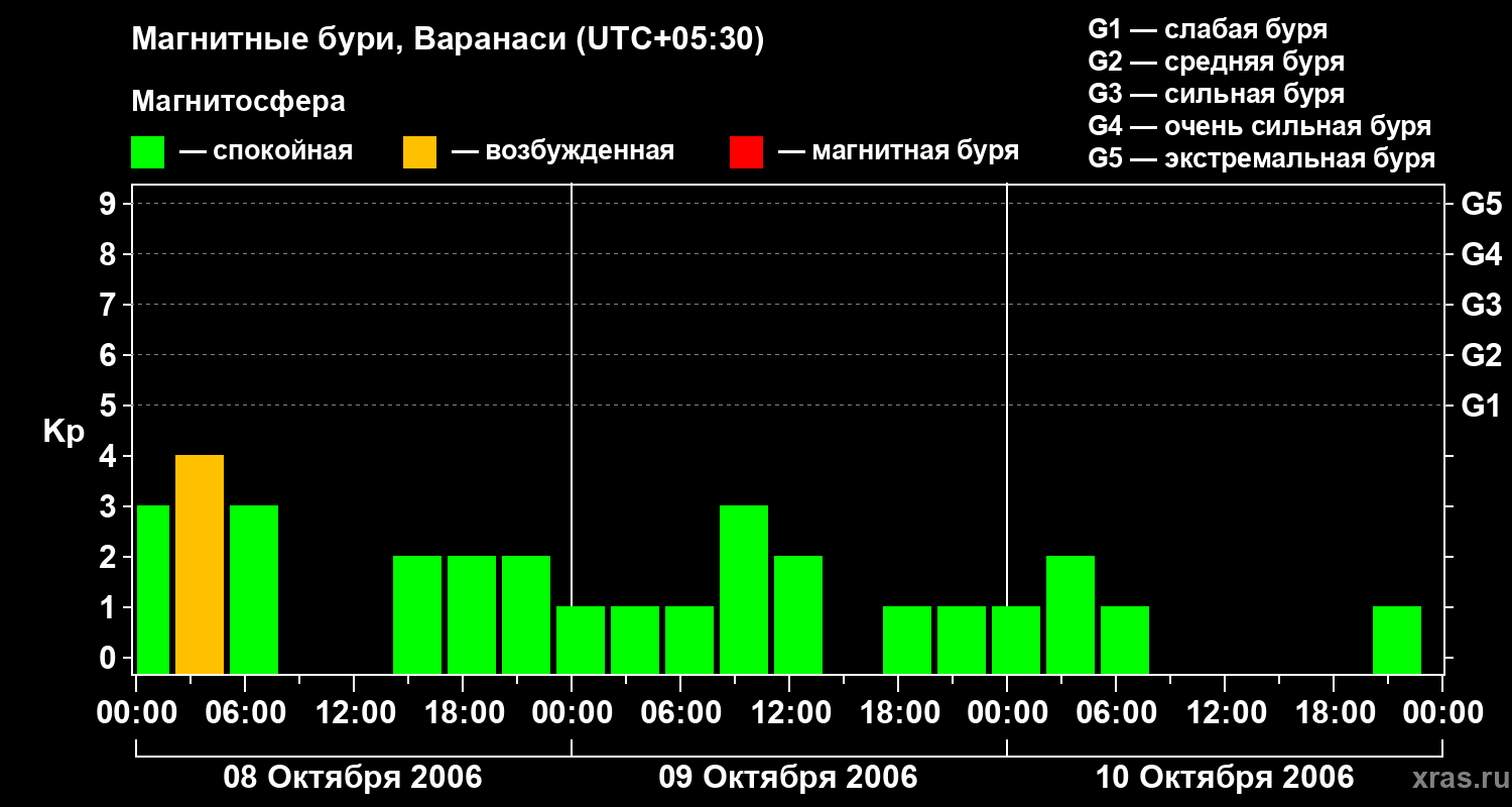 Изменения геомагнитного индекса Kp с 8 по 10 октября 2006 года для средних широт