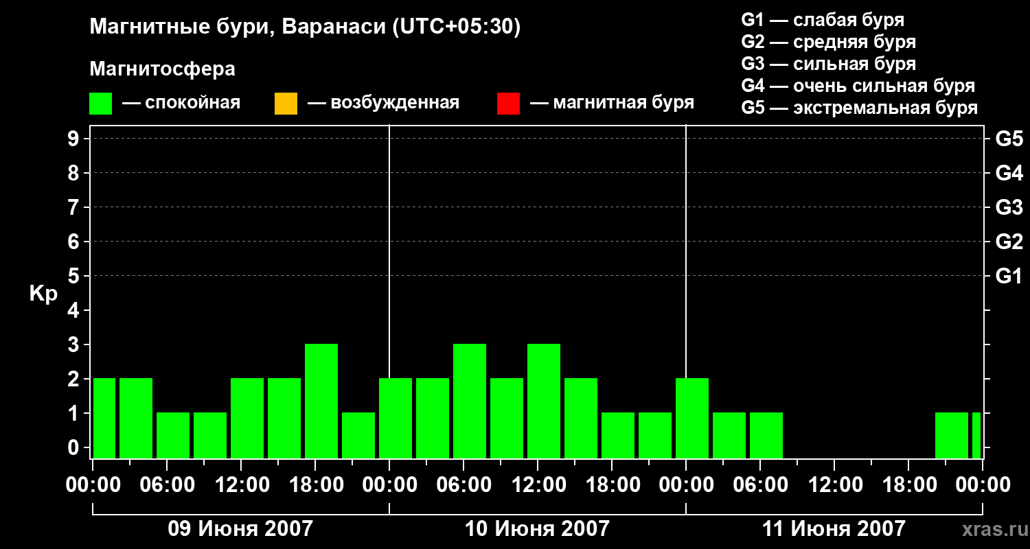 Изменения геомагнитного индекса Kp с 9 по 11 июня 2007 года для средних широт