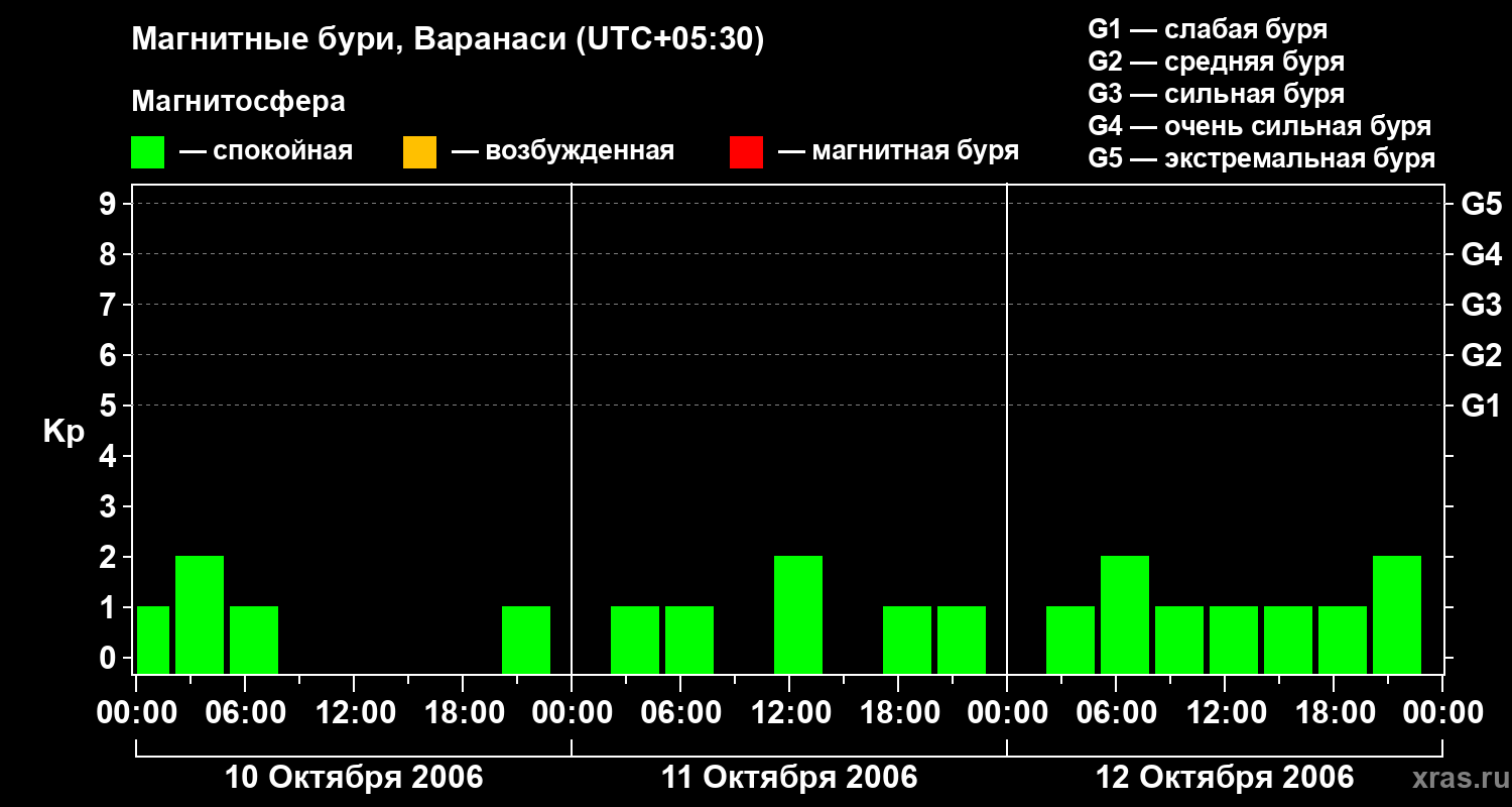 Изменения геомагнитного индекса Kp с 10 по 12 октября 2006 года для средних широт