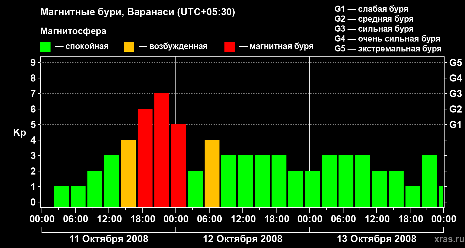 Изменения геомагнитного индекса Kp с 11 по 13 октября 2008 года для средних широт