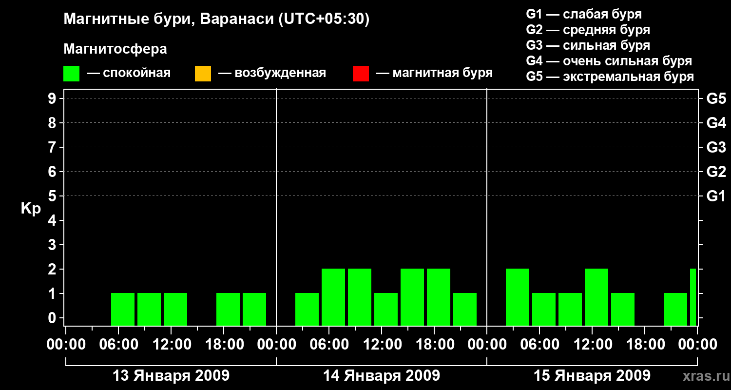 Изменения геомагнитного индекса Kp с 13 по 15 января 2009 года для средних широт