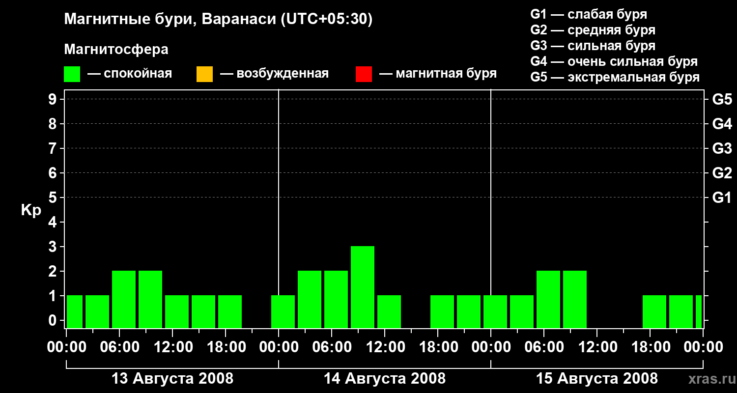 Изменения геомагнитного индекса Kp с 13 по 15 августа 2008 года для средних широт