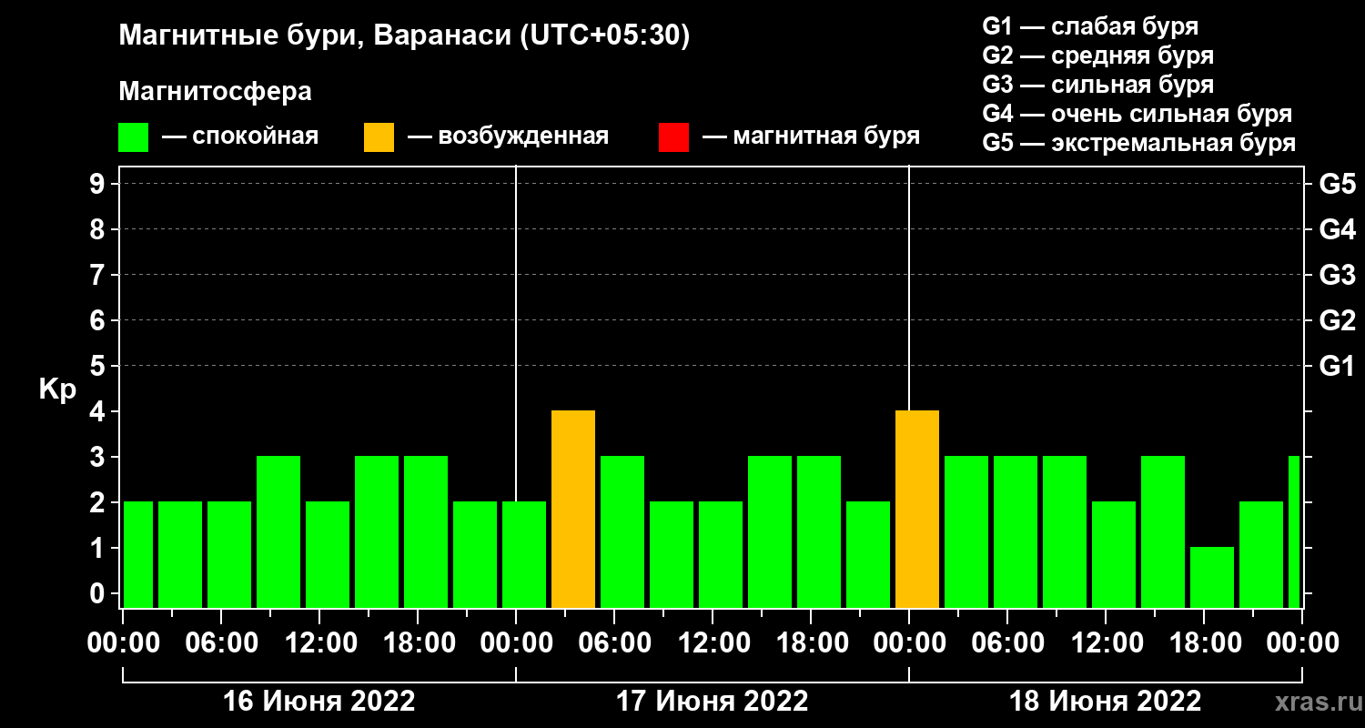 Изменения геомагнитного индекса Kp с 16 по 18 июня 2022 года для средних широт