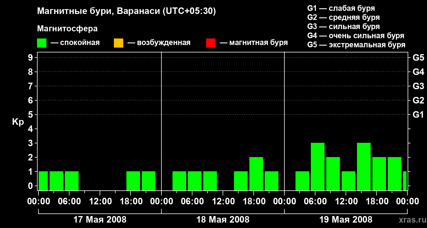 Изменения геомагнитного индекса Kp с 17 по 19 мая 2008 года для средних широт