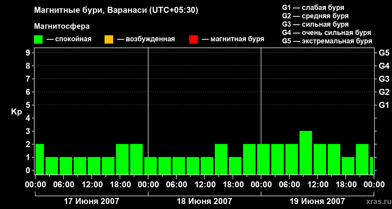 Изменения геомагнитного индекса Kp с 17 по 19 июня 2007 года для средних широт