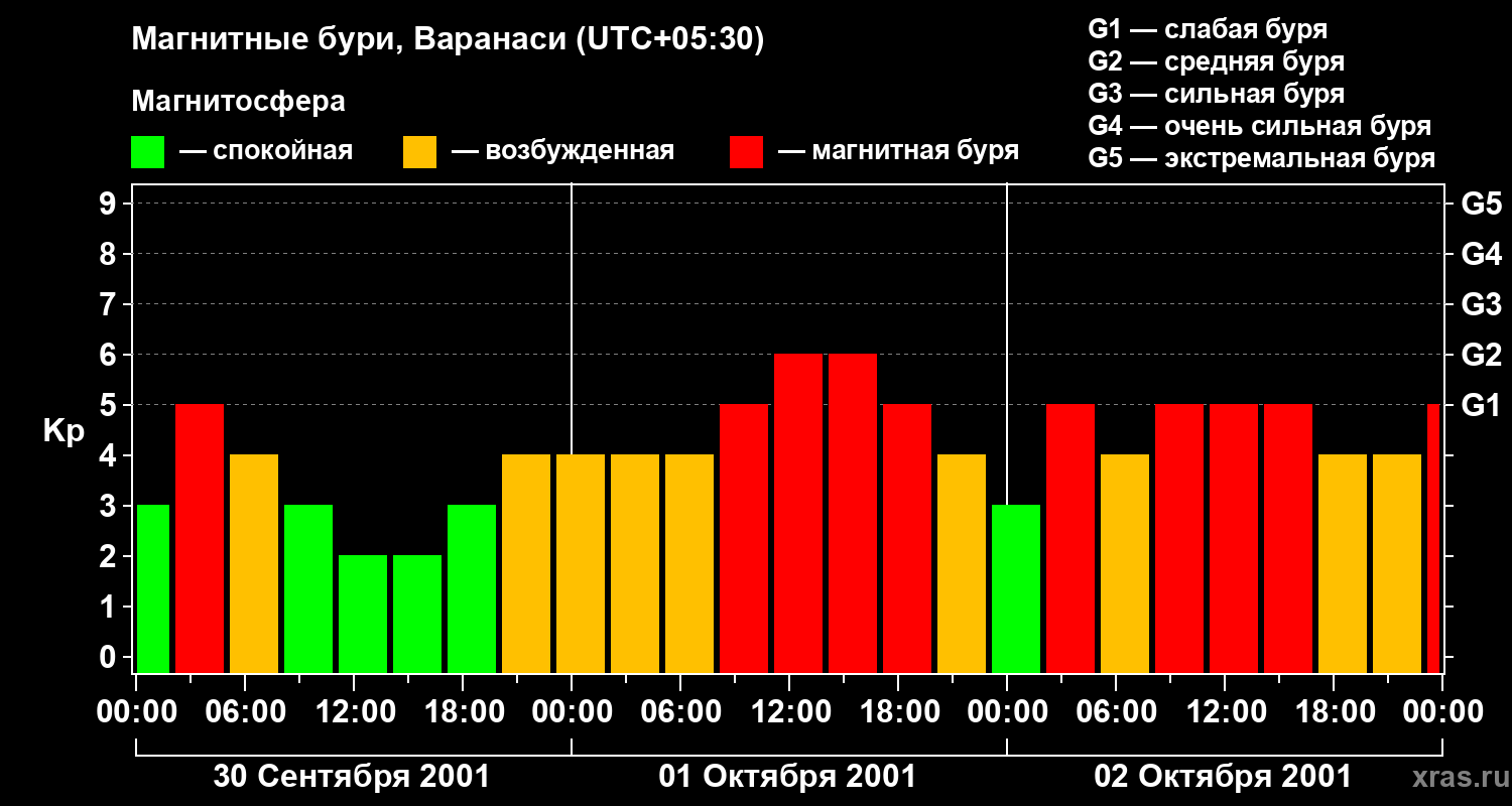 Изменения геомагнитного индекса Kp с 30 сентября по 2 октября 2001 года для средних широт