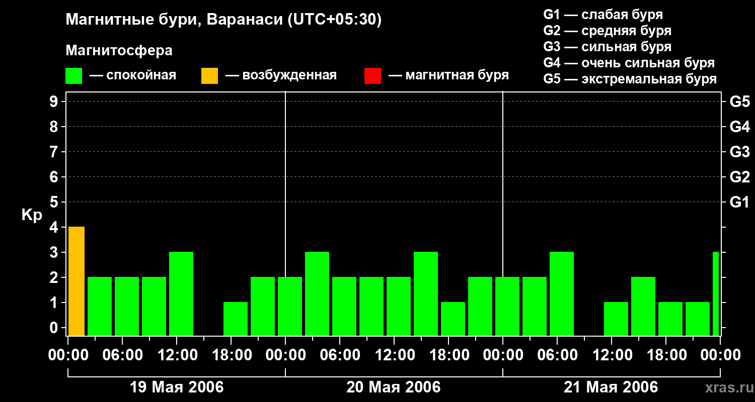 Изменения геомагнитного индекса Kp с 19 по 21 мая 2006 года для средних широт