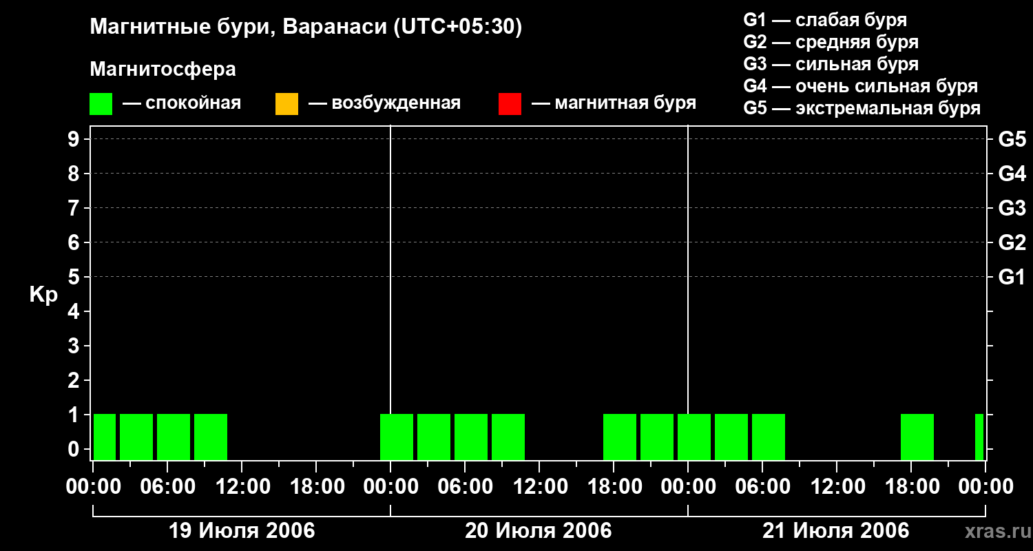 Изменения геомагнитного индекса Kp с 19 по 21 июля 2006 года для средних широт