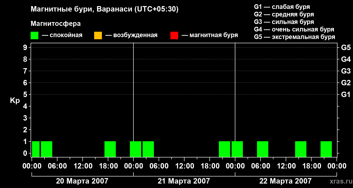 Изменения геомагнитного индекса Kp с 20 по 22 марта 2007 года для средних широт