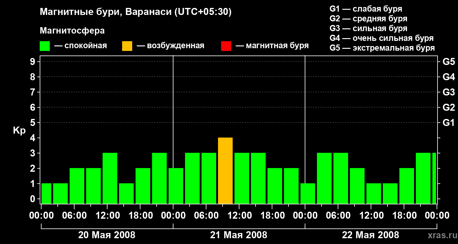 Изменения геомагнитного индекса Kp с 20 по 22 мая 2008 года для средних широт