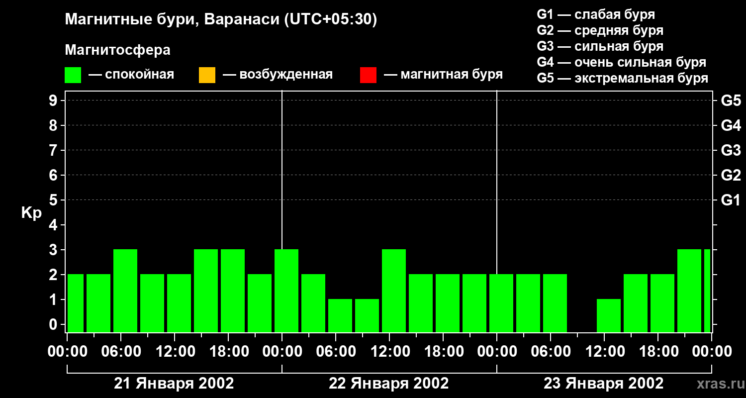 Изменения геомагнитного индекса Kp с 21 по 23 января 2002 года для средних широт