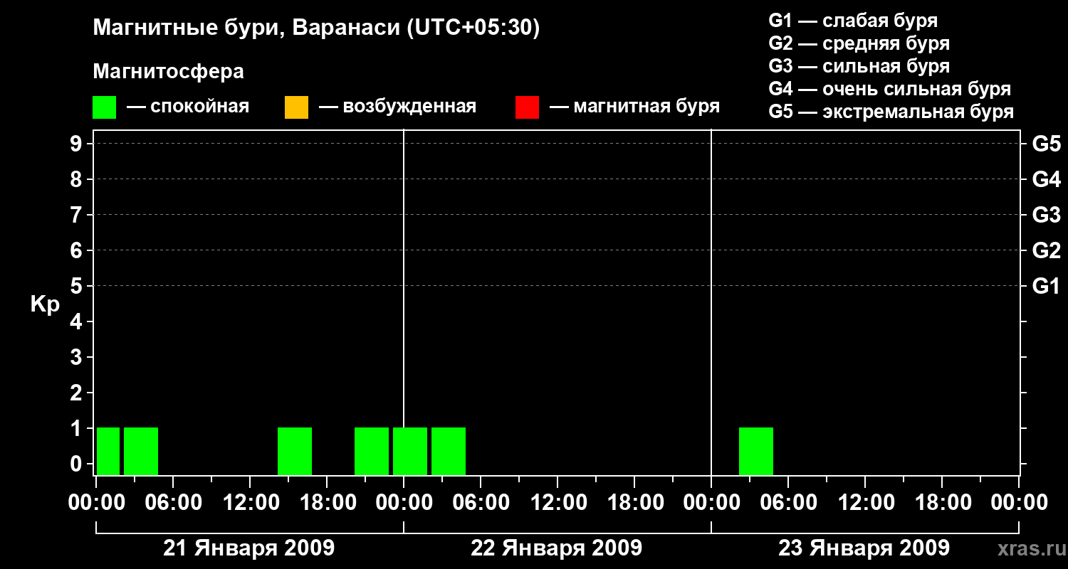 Изменения геомагнитного индекса Kp с 21 по 23 января 2009 года для средних широт