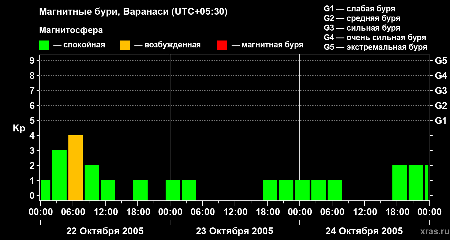 Изменения геомагнитного индекса Kp с 22 по 24 октября 2005 года для средних широт
