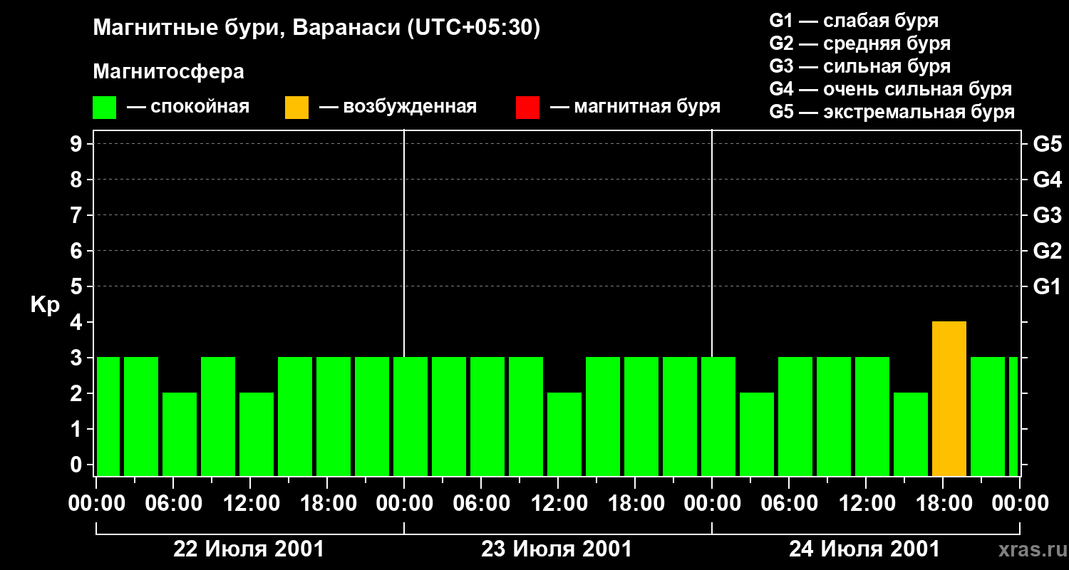 Изменения геомагнитного индекса Kp с 22 по 24 июля 2001 года для средних широт