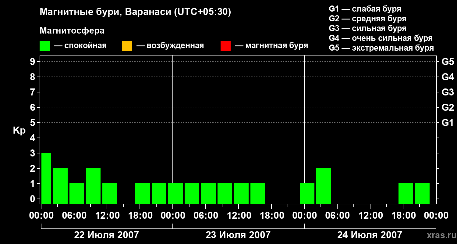 Изменения геомагнитного индекса Kp с 22 по 24 июля 2007 года для средних широт