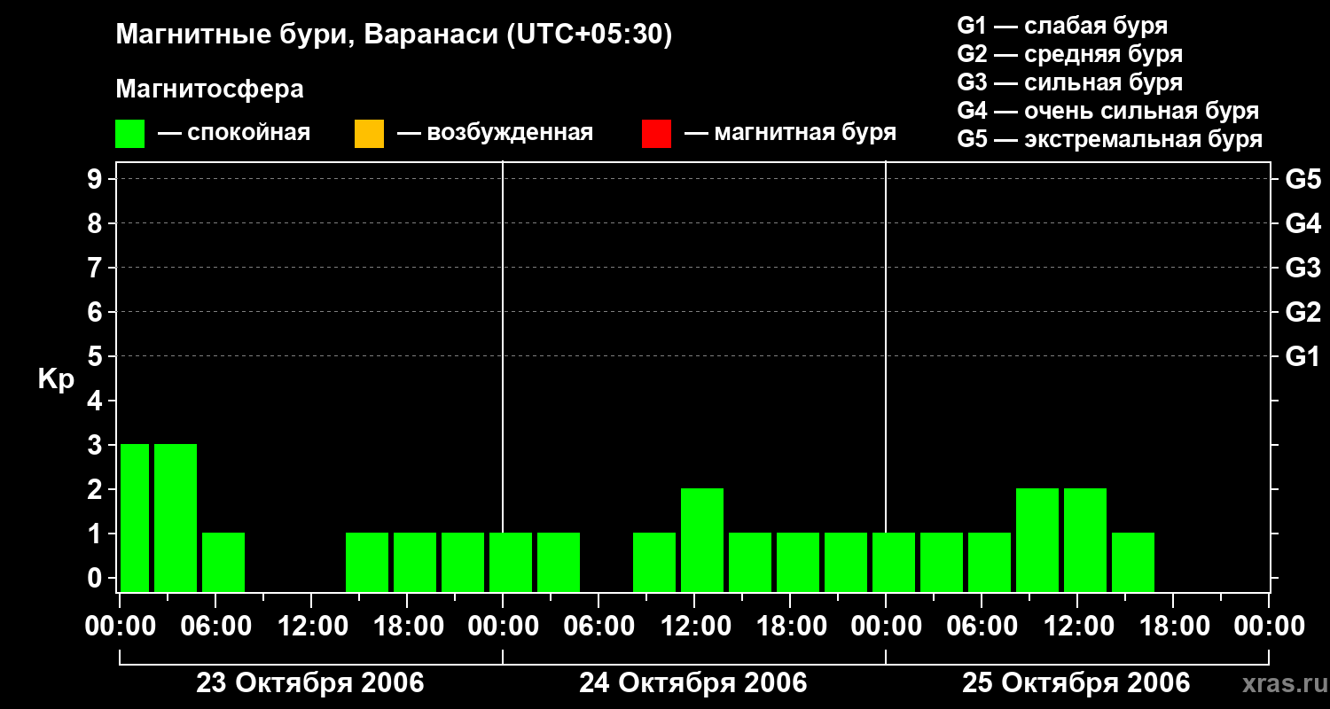 Изменения геомагнитного индекса Kp с 23 по 25 октября 2006 года для средних широт
