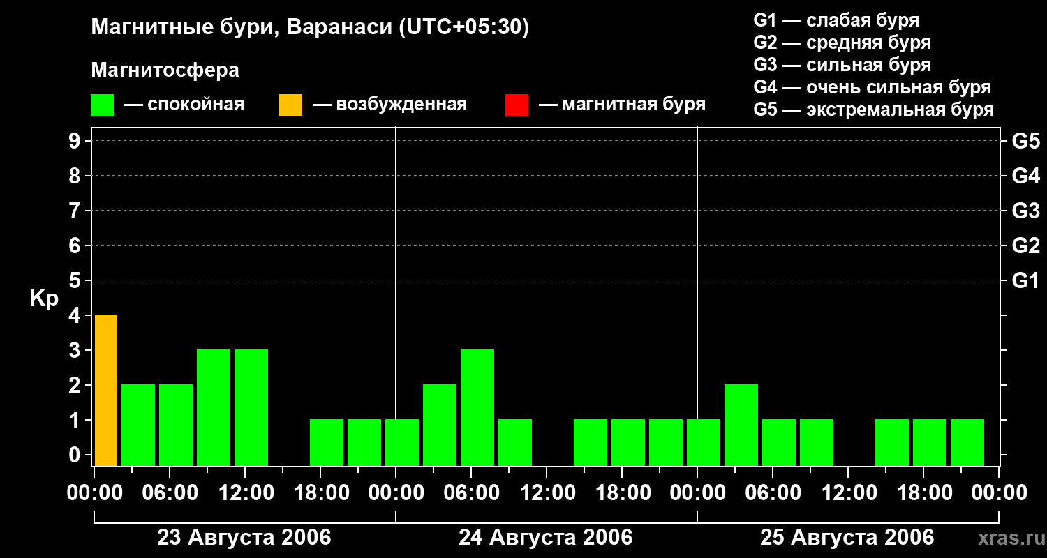 Изменения геомагнитного индекса Kp с 23 по 25 августа 2006 года для средних широт