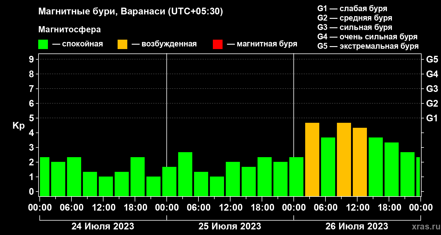 Изменения геомагнитного индекса Kp с 24 по 26 июля 2023 года для средних широт