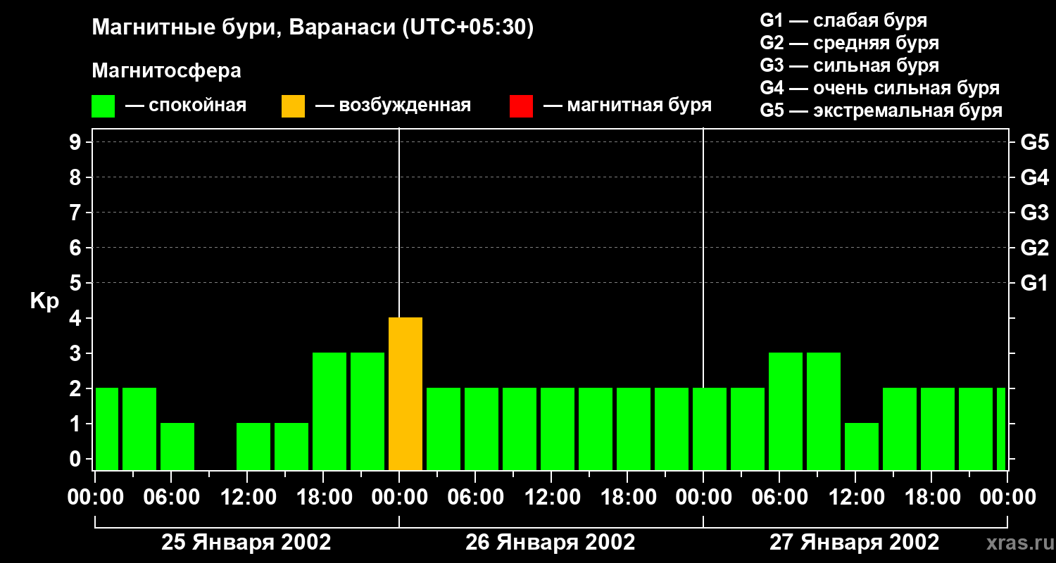 Изменения геомагнитного индекса Kp с 25 по 27 января 2002 года для средних широт