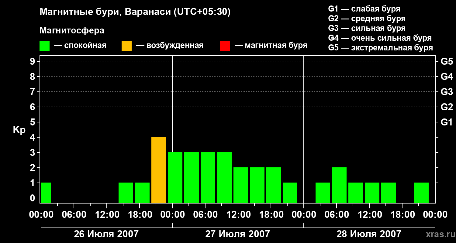 Изменения геомагнитного индекса Kp с 26 по 28 июля 2007 года для средних широт