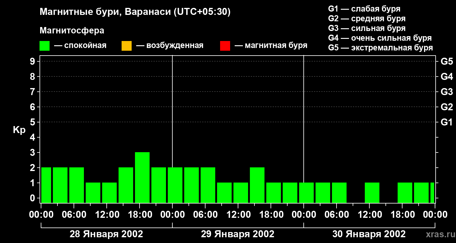 Изменения геомагнитного индекса Kp с 28 по 30 января 2002 года для средних широт
