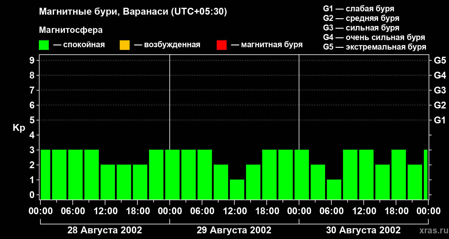 Изменения геомагнитного индекса Kp с 28 по 30 августа 2002 года для средних широт