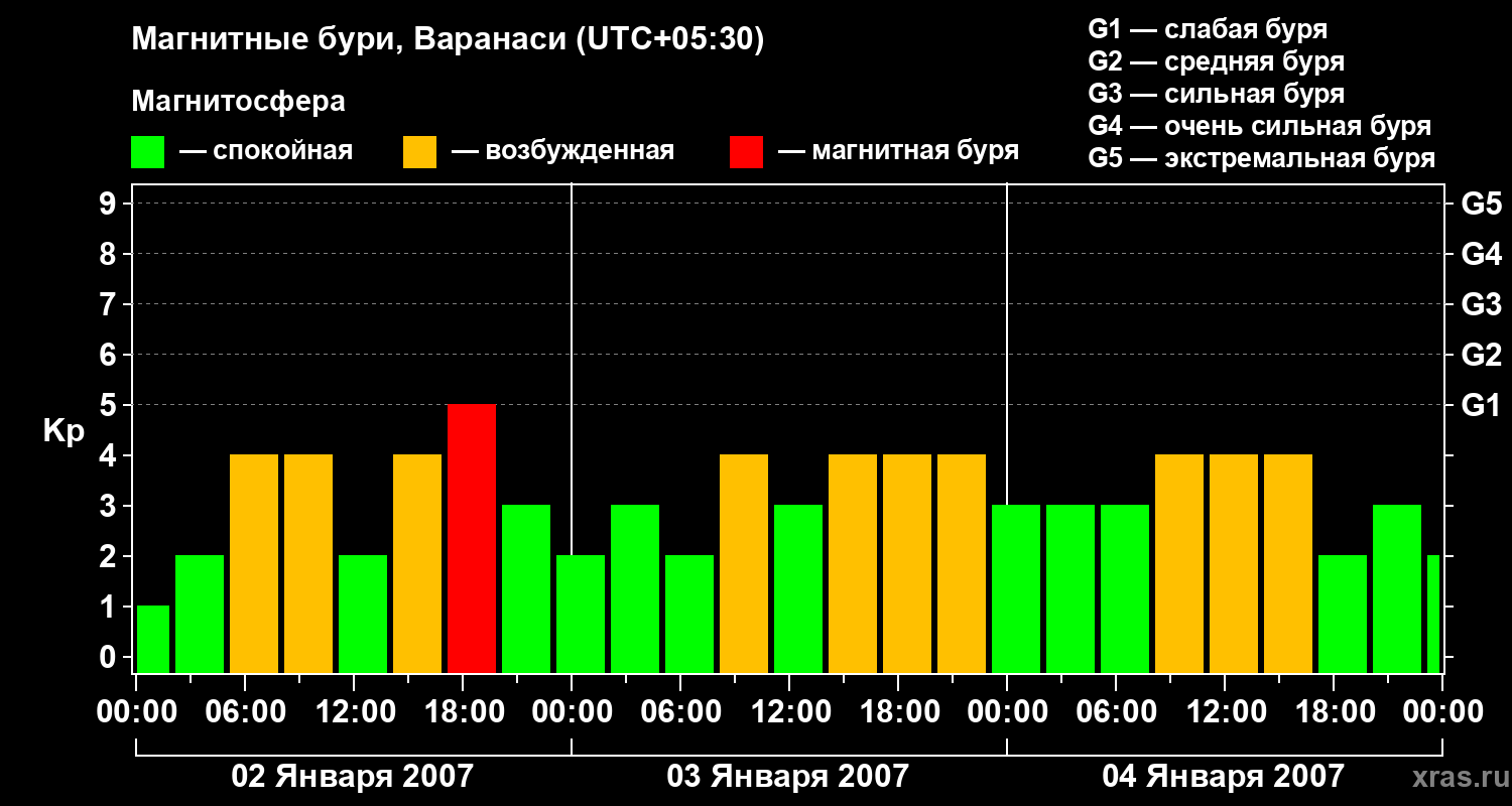 Изменения геомагнитного индекса Kp с 2 по 4 января 2007 года для средних широт