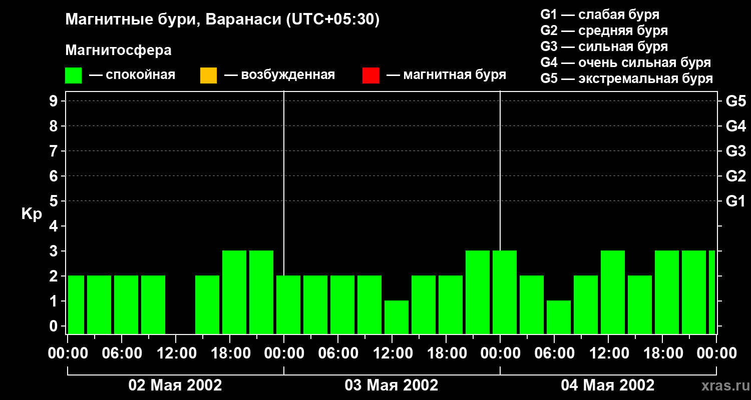 Изменения геомагнитного индекса Kp с 2 по 4 мая 2002 года для средних широт