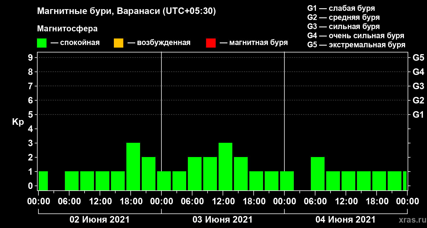 Изменения геомагнитного индекса Kp с 2 по 4 июня 2021 года для средних широт