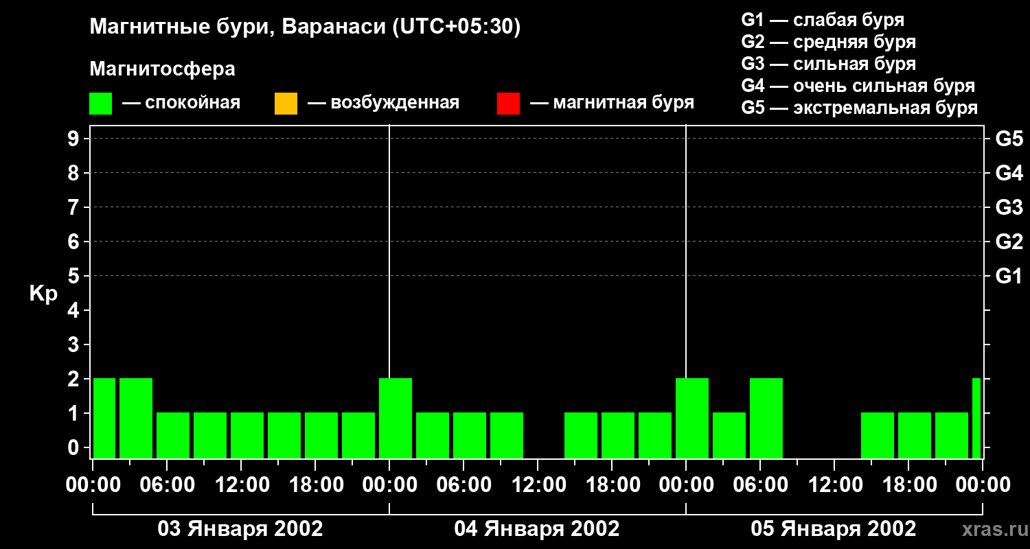 Изменения геомагнитного индекса Kp с 3 по 5 января 2002 года для средних широт
