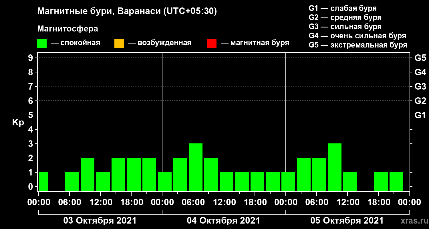 Изменения геомагнитного индекса Kp с 3 по 5 октября 2021 года для средних широт