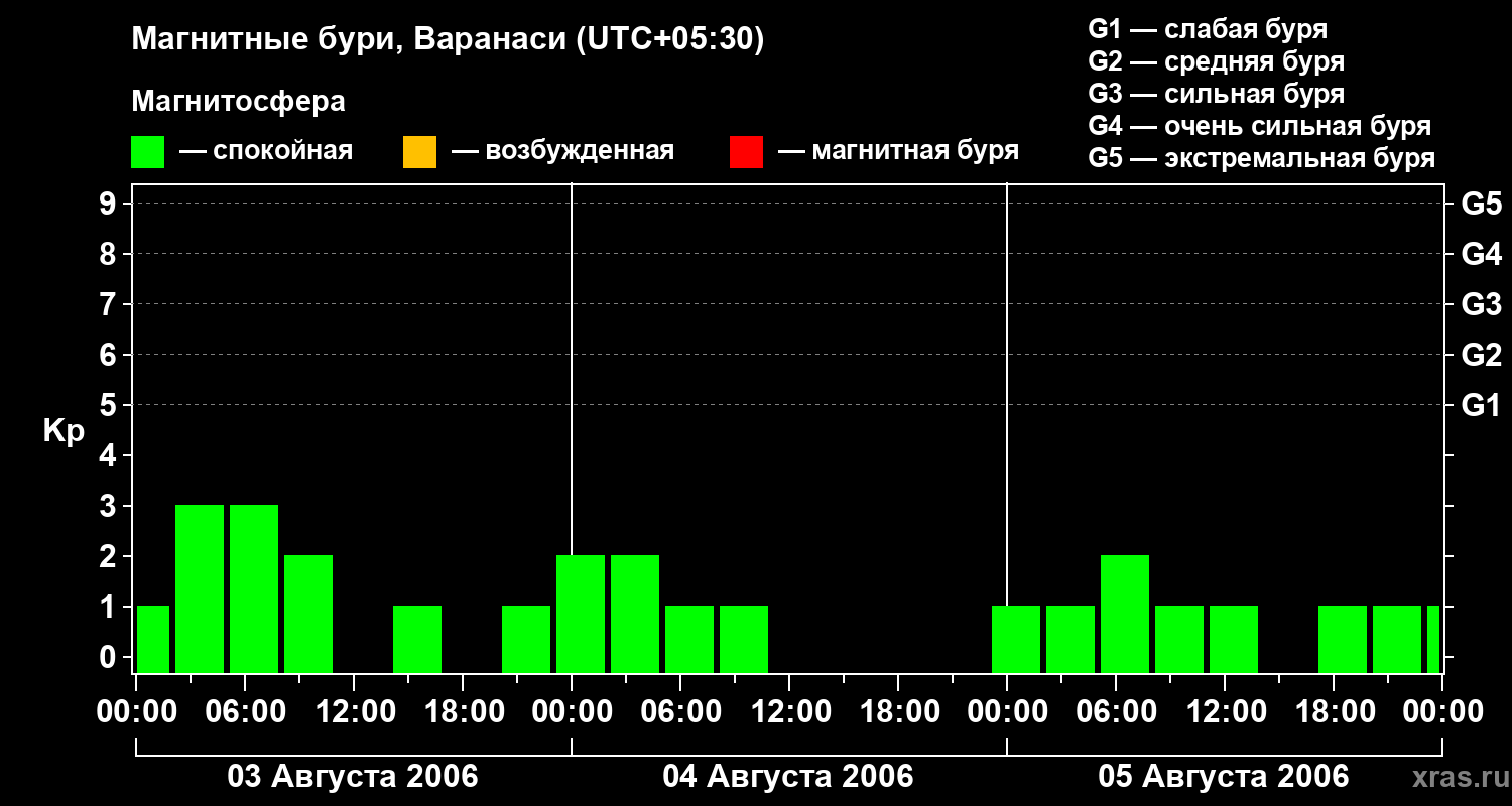 Изменения геомагнитного индекса Kp с 3 по 5 августа 2006 года для средних широт