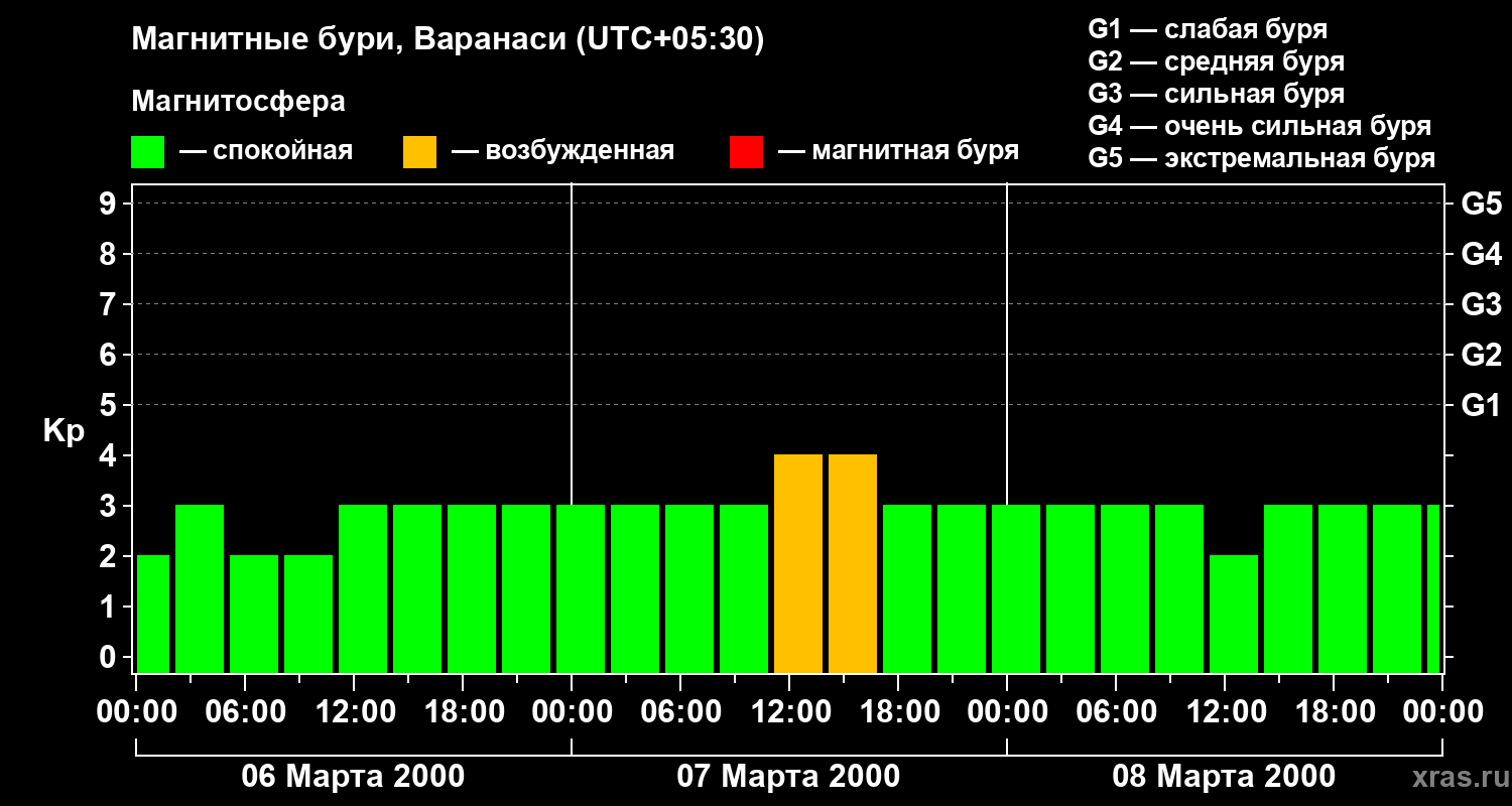 Изменения геомагнитного индекса Kp с 6 по 8 марта 2000 года для средних широт