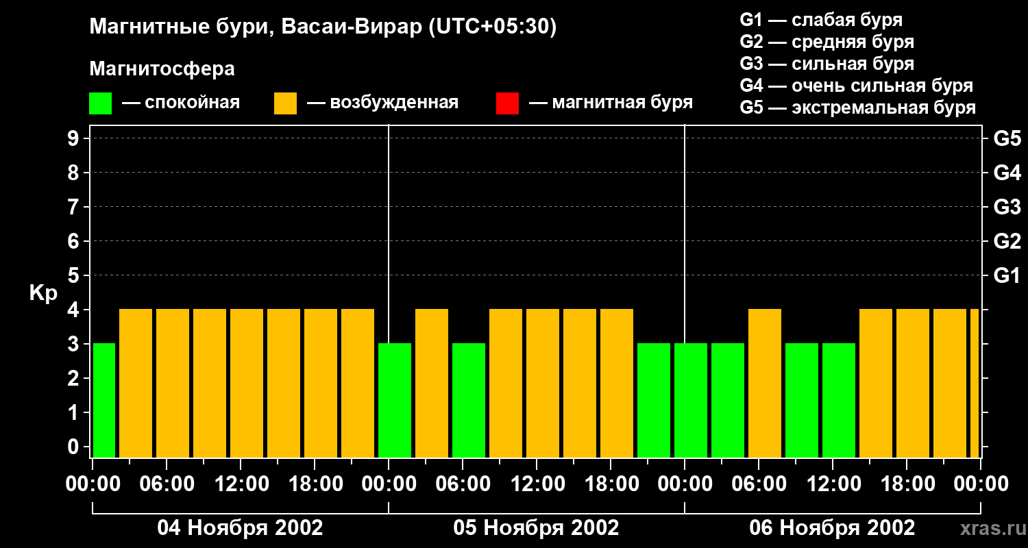 Изменения геомагнитного индекса Kp с 4 по 6 ноября 2002 года для средних широт